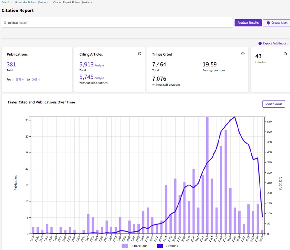 - Indice Hirsch 43+ (în Web of Science) cu 5600+ citări.